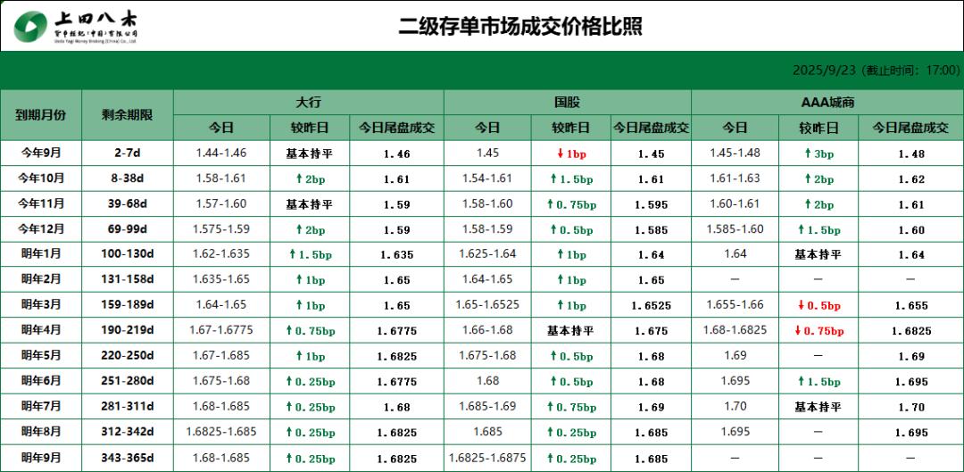 据央行公告,今日开展2761亿元7天期逆回购操作,利率持稳于1.4%。今日公开市场有2870亿元逆回购到期,净回笼109亿元。DR001均价1.4141%,较前一交易日下行1.36bps;DR007均价1.4754%,较前一交易日下行1.34bps;DR014均价1.5938%,较前一交易日下行7.24bps;早盘隔夜质押国股利率成交在1.50%-1.53%附近,7D质押国股利率成交在1.53%-1.55%附近,跨月14D各券质押ofr在1.7%-1.76%附近;公开市场操作后,隔夜质押国股利率成交在1.52%-1.53%附近,7d质押各券在1.53%-1.60%附近成交,其余更长期限成交寥寥。午后,资金面维持均衡态势,隔夜质押国股利率于1.50%-1.55%区间成交,质押其他各券于1.55%-1.58%区间成交;7D质押国股利率成交在1.55%-1.56%区间,质押其他各券于1.56%-1.60%区间成交。临近尾盘,隔夜押国股利率成交在1.50%附近。 境内市场:今日境内美元资金面均衡偏紧。o/n 成交于4.05-4.07;t/n 报于4.05-4.07;1w 成交于4.10-4.12;1s 报于4.10-4.12。 境外市场:今日境外资金流动性相对紧张,且港澳地区受台风天气影响,短期限价格上浮较大。o/n 报于4.08-4.12,区间内成交;t/n 报于4.08-4.15;s/n 报于4.10-4.13;1w 报于4.15-4.20;2w 报于4.20-4.23,区间内成交;3w 报于4.18-4.20;1s 报于4.20-4.23,区间内成交;2s 报于4.14-4.22;成交于4.20、4.22;3s 报于4.12-4.15;6s 报于4.00-4.02;1y 报于3.90-3.95,区间内成交。 其他币种:CNH o/n 报于0.50-0.70;tod2d 报于1.30;1s 报于1.50-1.65;3s 报于1.60-1.65。HKD on/2d 报于4.30-4.50;2w 报于3.80-4.10;1s 报于3.50-3.70,2s/3s 报于3.60-3.70;3s 报于3.50。EUR 1y 报于2.10-2.15。JPY 3s 报于0.55。GBP o/n -t/n 报于3.95。AUD 1s 报于3.75。截至下午五点十分,9月23日一级存单实际发行90支存单,实际发行量为1365亿;9月24日一级存单计划发行48支存单,计划发行量为603.1亿。今日除1M、1Y外均为工作日到期。整体3M、9M交投情绪较好。1M国股大行发在1.57%-1.59%区间,未获买盘青睐;AAA城农商发在1.57%-1.61%区间,部分城商行在1.60%的位置收获少量募集。3M国股大行发在1.58%的位置,部分国股大行在1.58%的位置逐渐起量并募满;AAA城农商发在1.57%-1.65%区间,部分城农商行在1.59%的位置募集到量。6M国股大行发在1.63%-1.65%区间,个别国股在1.65%位置收获不错募集;AAA城农商发在1.63%-1.75%区间,个别城农商在1.66%-1.71%区间收获一定量募集。9M国股大行发在1.66%-1.69%区间,部分大行于1.68%-1.69%区间收获较多募集;AAA城商行发在1.68%-1.75%区间,个别城农商于1.70%位置收获一定量募集。1Y国股大行发在1.66%-1.69%区间,部分国股大行于1.68%的位置收获少量募集;AAA城农商发在1.68%-1.76%区间,整体交投冷淡。 今日市场交投情绪较好。全天各期限成交小幅波动。日内成交主要集中在12月到期和足年cd,早盘伊始,12月到期国股大行从1.58%迅速下降0.5bp后平稳上行到1.59%;足年大行从1.68%一路上行至1.685%,随后稳定在1.6825%成交。临近尾盘,足年大行成交在1.6825%,较昨日尾盘上行约0.25bp;足年国股成交在1.6875%,较昨日尾盘上行约0.5bp。 具体来看,1M国股大行成交在1.54%-1.61%之间;3M国股大行成交在1.575%-1.59%之间;6M国股大行成交在1.64%-1.65%之间;9M国股大行成交在1.675%-1.69%之间;足年国股大行成交在1.68%-1.6875%之间。今年10月 8-38d 1.62 1.61 1.61 今年11月 39-68d 1.61 1.60 1.60 今年12月 69-99d 1.60 1.59 1.59明年1月 100-130d 1.64 1.635 1.64明年2月 131-158d 1.65 1.6475 1.65明年3月 159-189d 1.655 1.6525 1.6525明年4月 190-219d 1.6775 1.675 1.6775明年5月 220-250d 1.6825 1.68 1.6825明年6月 251-280d 1.685 1.68 1.68明年7月 281-311d 1.69 1.6875 1.69明年8月 312-342d 1.69 1.685 1.685明年9月 343-365d 1.6875 1.685 1.6875市场表现:今日票据市场,维持上周五走势,各期限利率继续窄幅震荡。早盘开盘后,跨年票市场仍然围绕大行报价成交,随着大行陆续进场收票,3月到期国股大商小幅下行。年内票交易仍是小行参与居多,配置需求为主波动较小。