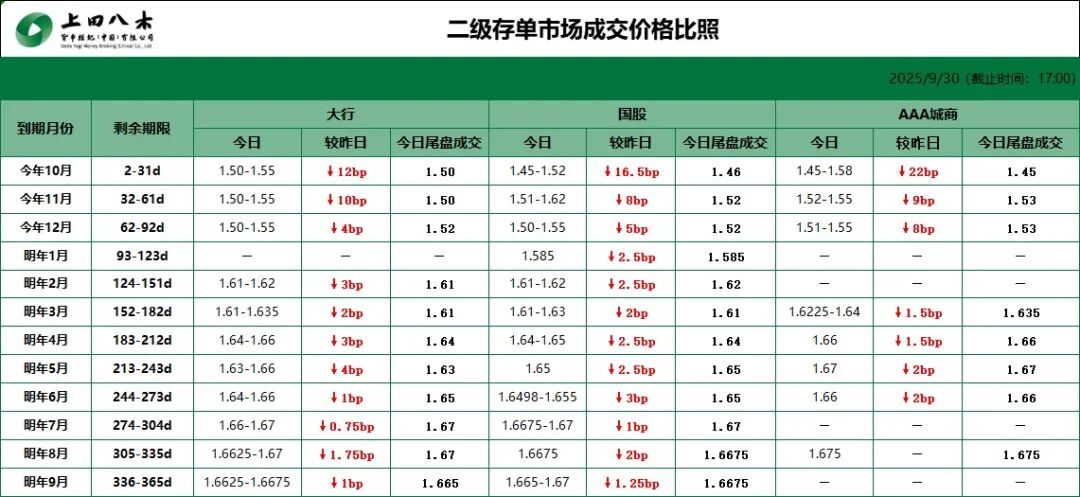 中国央行今日开展2422亿元7天逆回购操作,投标量2422亿元,中标量2422亿元,操作利率为1.40%,与此前持平。今日有2761亿元7天期逆回购到期。DR001均价1.3855%,较前一交易日上行7.52bps;DR007均价1.4376%,较前一交易日下行14.97bps;DR014均价1.6523%,较前一交易日下行17.10bps;早盘隔夜押利率国股成交在1.75%-1.85%区间,9点之后,隔夜质押各券成交在1.60%-1.70%左右,OMO之后于1.60%-1.62%附近成交;14D质押各券ofr在1.55%-1.85%附近,其他更长期成交寥寥。午后,隔夜押利率成交在1.52%-1.60%附近。临近尾盘,隔夜质押各券ofr在1.55%附近。 境内市场:今日境内美元资金面整体均衡。o/n 成交于4.01-4.06;节后3w成交于4.12;1s ofr报于4.10。 境外市场:今日境外市场交投活跃。跨国庆o/n 成交于4.18-4.21;2w 报于4.17;3w 有成交位于4.18;1s 报于4.20,或有成交位于4.24-4.27;2s 报于4.15-4.20&4.25;6s 报于4.00-4.05;7s报于4.04;1y报于3.92。 其他币种:CNH tod9d、tod10d ofr报于1.80,拆入报于1.55-1.60;1s报于1.45;2s报于1.50;3s报于1.55。HKD 6s有融出兴趣位于3.45。EUR t/n报于1.90;1w报于1.92;3w有成交位于1.92。截至下午五点,9月30日一级存单实际发行16支存单,实际发行量为43.9亿;10月9日一级存单计划发行15支存单,计划发行量为52.5亿。1M国股大行发在1.56%附近,并在此位置募满;AAA城农商发在1.56%-1.57%区间,大部分城商行于此区间募满。3M国股大行发在1.56%位置,鲜有募集;AAA城农商发在1.56%-1.65%区间,交投冷清。6M国股大行发在1.62%位置,未获买盘关注;AAA城农商发在1.64%-1.75%区间,市场情绪一般。9M国股大行发在1.63%-1.65%区间,未获买盘青睐;AAA城商行发在1.65%-1.75%区间,未有明显募集。1Y国股大行发在1.63%-1.65%区间,交投情绪一般;AAA城农商发在1.68%-1.76%区间,鲜有募集。 今日市场交投情绪较平淡。全天各期限成交小幅波动。收益率整体较昨日大幅下降。日内成交主要集中足年cd,早盘伊始,足年大行在1.665%震荡下行到1.6625%后上行至1.6675%,随后在1.6625%-1.665%之间波动。临近尾盘,足年大行成交在1.665%,较昨日尾盘下行约1bp;足年国股成交在1.6675%,较昨日尾盘下行约1.25bp。 具体来看,1M国股大行成交在1.45%-1.56%之间;3M国股大行少量成交在1.50%-1.52%之间;6M国股大行成交在1.61%-1.64%之间;9M国股大行成交在1.64%-1.67%之间;足年国股大行成交在1.6625%-1.67%之间。今年10月 2-31d 1.50 1.40 1.50 今年11月 32-61d 1.52 1.51 1.52 今年12月 62-92d 1.52 1.51 1.52 明年2月 124-151d 1.62 1.60 1.62明年3月 152-182d 1.62 1.61 1.61明年4月 183-212d 1.64 1.62 1.64明年5月 213-243d 1.65 1.64 1.65明年6月 244-273d 1.65 1.64 1.65明年7月 274-304d 1.67 1.66 1.6675明年8月 305-335d 1.67 1.6675 1.6675明年9月 336-365d 1.6675 1.665 1.665市场表现:今日票据市场,跨年票价格持续上涨,短期票仍旧保持区间振荡。早盘开盘后,足月价格从0.90%后价格上行明显,大行纷纷调高价格收票。至午后成交渐缓,整体价格略有回升,尾盘足月双国收在0.95%附近震荡。